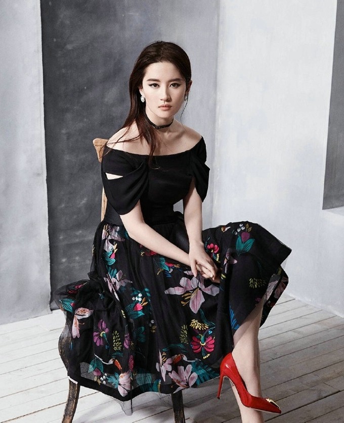 刘亦菲黑色一字肩裙装搭配冷色调裙摆,眼神疏离,散发冷艳时髦气息